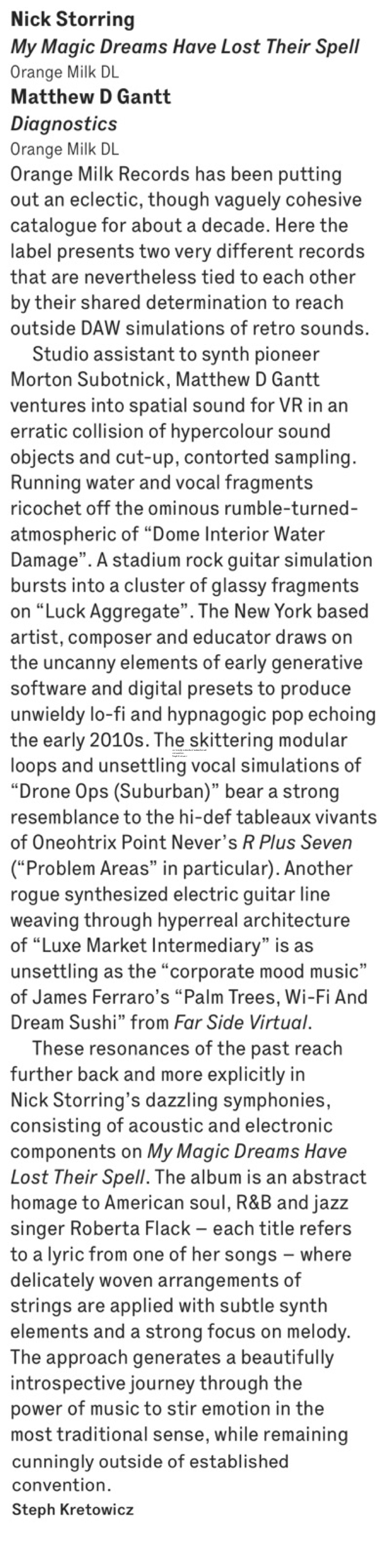 “Storring uses the lush string sound of Flack’s 1970s hits as a launching point for deep sonic immersions that are considerably more emotionally oblique than their inspirations’ articulations of loneliness and surrender. When he goes melodic, the cello-led tunes seem to reach for something that they never touch, and when he goes for slow-motion density, the music imparts an experience akin to watching the sort of cinematic experience where you can’t tell if you’re seeing a really slow take or the film has frozen at a single frame.”